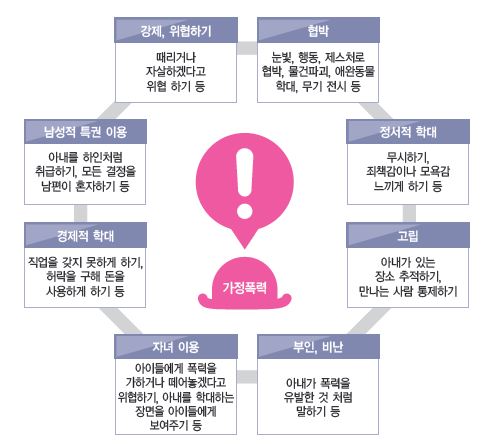 | 가정 폭력의 유형 | 폭력의 예시 | 1 | 강제, 위협하기 | 때리거나 자살하겠다고 위협하기 등 | 2 | 협박 | 눈빛, 행동, 제스처로 협박, 물건파괴, 애완동물학대, 무기 전시 등 | 3 | 정서적 학대 | 무시하기, 죄책감이나 모욕감 느끼게 하기 등 | 4 | 고립 | 배우자가 있는 장소 추적하기, 만나는 사람 통제하기 | 5 | 부인, 비난 | 배우자가 폭력을 유발한 것처럼 말하기 등 | 6 | 자녀 이용 | 아이들에게 폭력을 가하거나 떼어놓겠다고 위협하기, 배우자를 학대하는 장면을 아이들에게 보여주기 | 7 | 경제적 학대 | 직업을 갖지 못하게 하기, 허락을 구해 돈을 사용하게 하기 등 | 8 | 남성적 특권 이용 | 아내를 하인처럼 취급하기, 모든 결정을 남편이 혼자하기 등 |