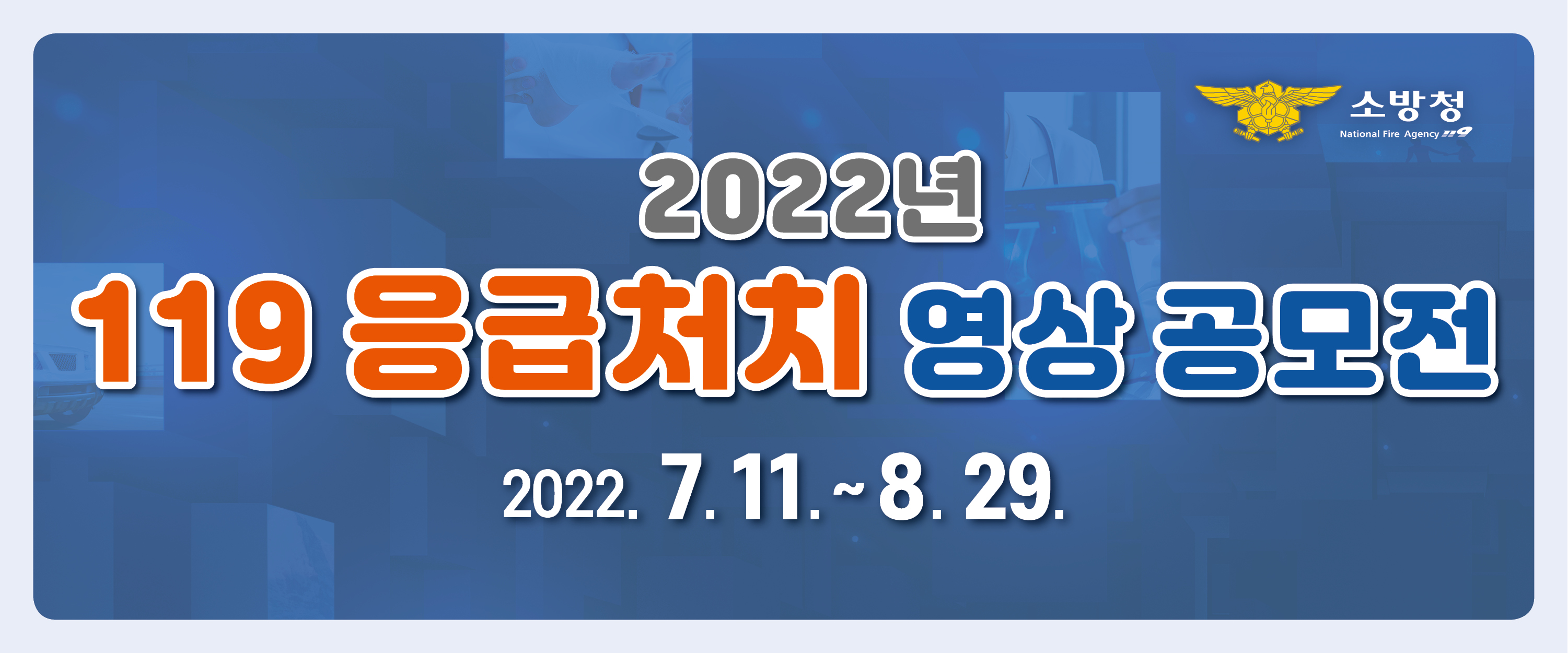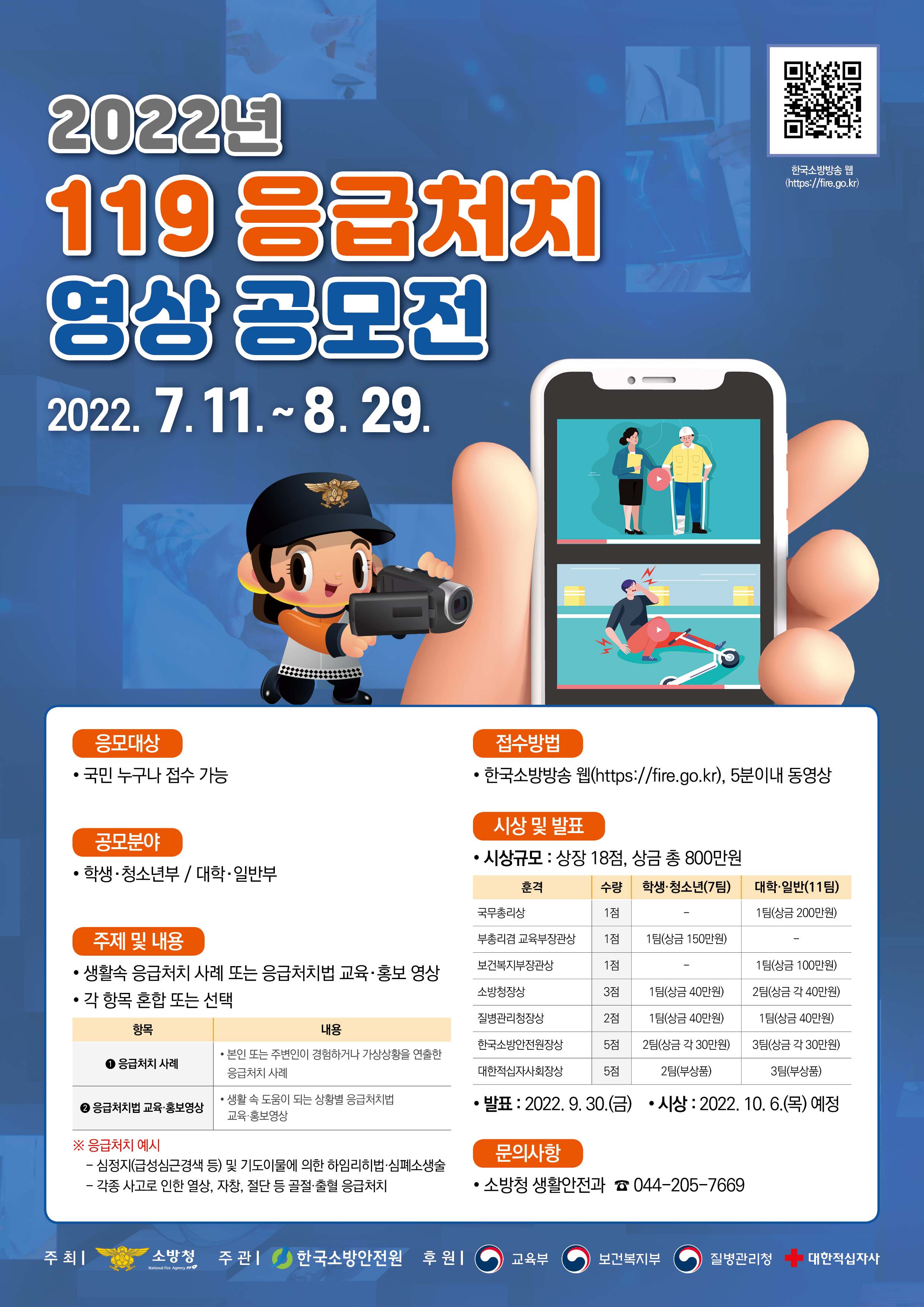 ○ (주최/주관) 소방청/한국소방안전원 ○ (후 원) 교육부, 보건복지부, 질병관리청, 대한적십자사 ○ (공모기간) 2022. 7. 11.(월) ~ 8. 29.(월) / 50일간 ○ (응모자격) 국민 누구나 응모 가능 ○ (공모주제) 응급처치법 교육·홍보용으로 활용 가능한 동영상 ○ (공모분야) 모든 형태의 동영상(5분 이내) ○ (시 상) 상장 18점, 총상금 800만원 ○ (응모방법) 인터넷 온라인 접수(https://fire.go.kr) 항 목 | 내 용 | ① 사 례 | ? 본인 또는 주변인이 실제 경험한 사례를 재연하거나 가상상황을 연출해 촬영한 영상 | ② 응급처치법 | ? 가상 질병·부상상황별 응급처치법 소개 영상 |