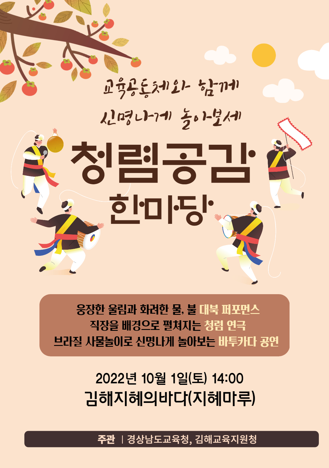 ○ 공연명: 2022년도 청렴공감 한마당 ○ 일 시: 2022. 10. 1.(토) 14:00 ○ 장 소: 김해지혜의바다(지혜마루) ○ 대 상: 교직원, 학생, 학부모(도민 누구나) ○ 내 용: - 대북 퍼포먼스: 웅장한 울림과 화려한 물·불 대북 퍼포먼스 - 청렴 연극: 직장을 배경으로 펼쳐지는 청렴 연극 - 바투카다 공연: 브라질 사물놀이로 신명나게 놀아보는 공연 마당 ○ 신청방법: 별도 신청 불필요(무료공연)