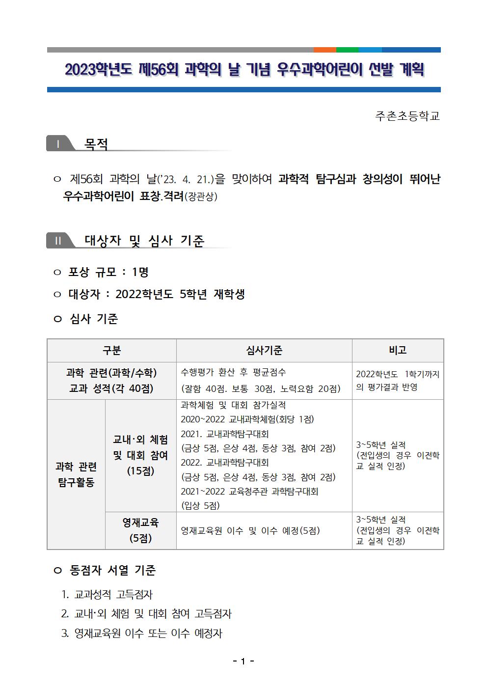 2023학년도 제56회 과학의 날 기념 우수과학어린이 선발 계획