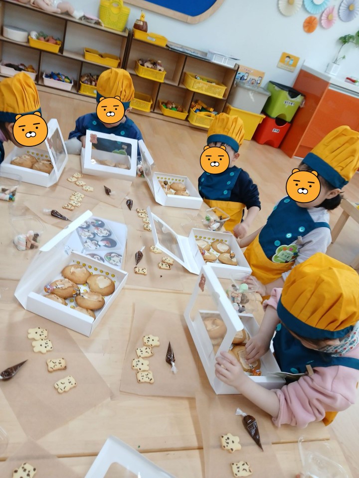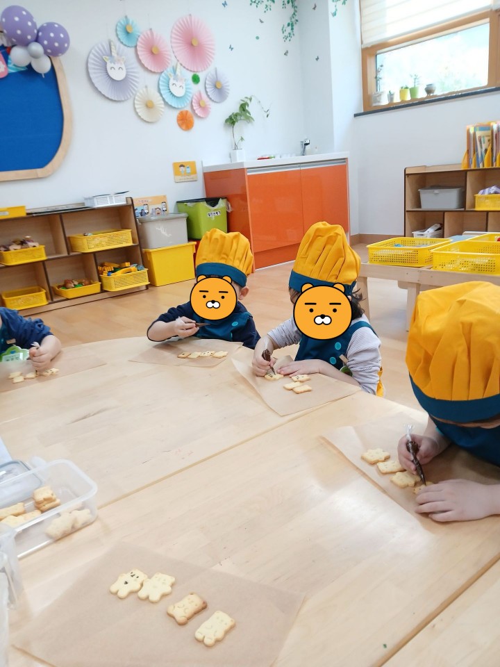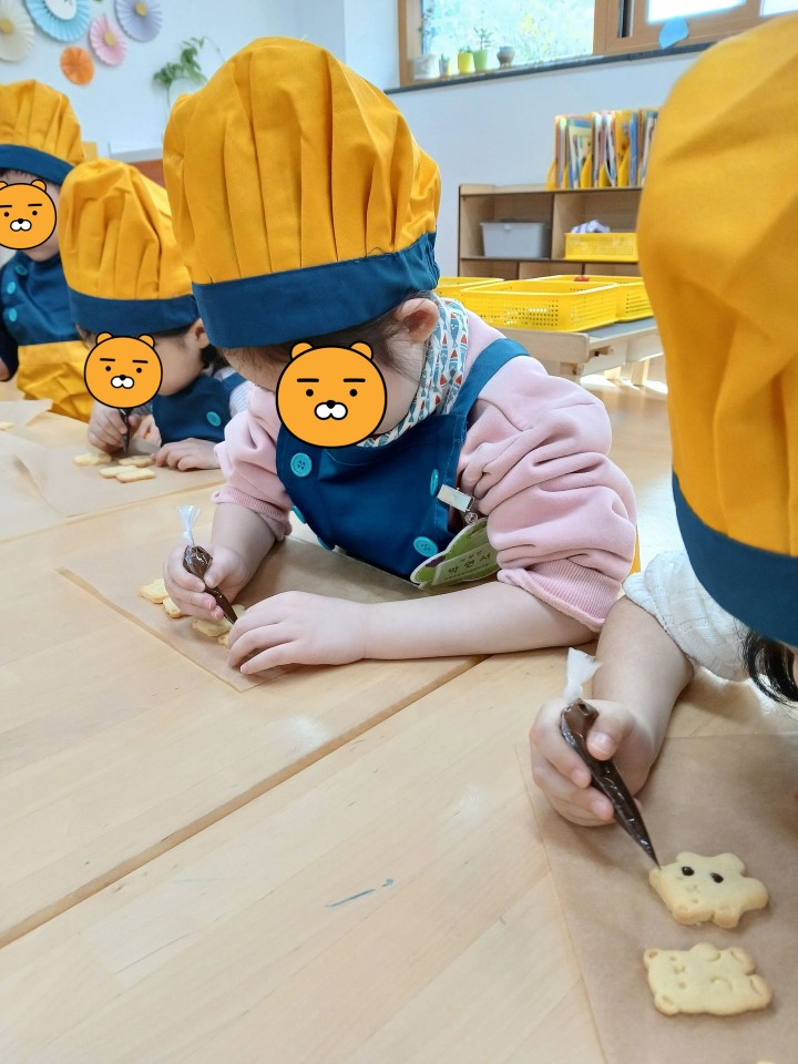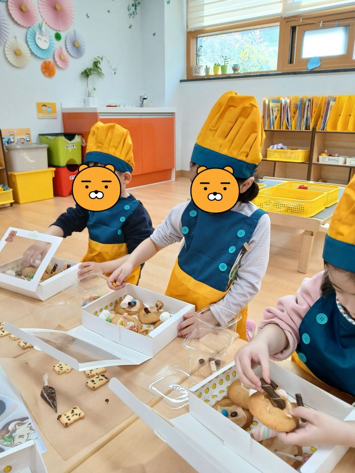베이킹 선생님과 함께 '사탕스모어쿠키'를 만들어보았습니다. 맛난 쿠키를 만들기위해 준비과정은 철저히! 손을 깨끗이 씻고 앞치마를 두르고 요리사 모자 쓴 후 본격적으로 쿠키를 만들었습니다. 고소한 땅콩쿠키 냄새가 사랑반 친구들을 유혹했지만, 가족과 함께 나눠먹기 위해 집으로 가져가기로 했어요^^