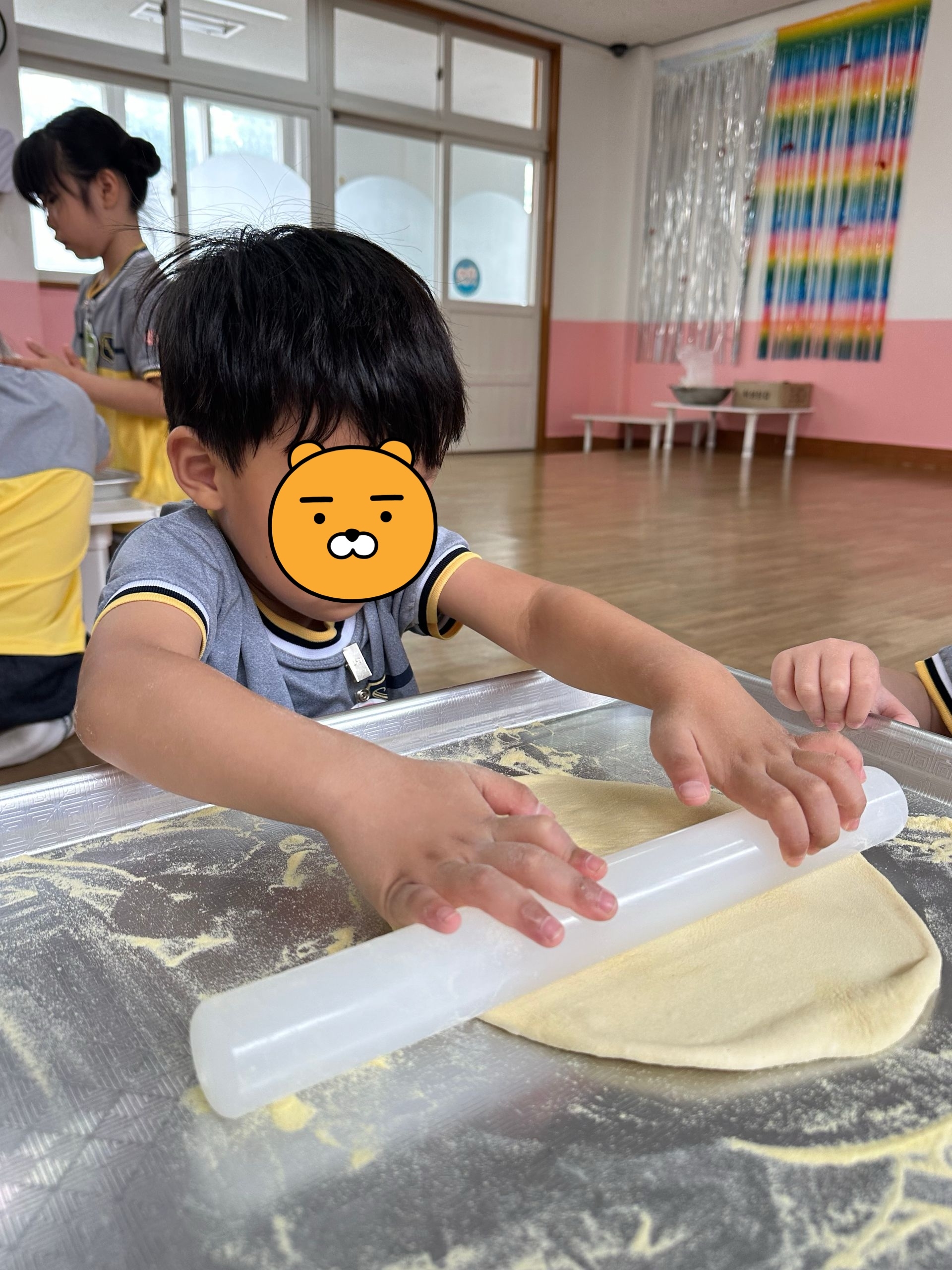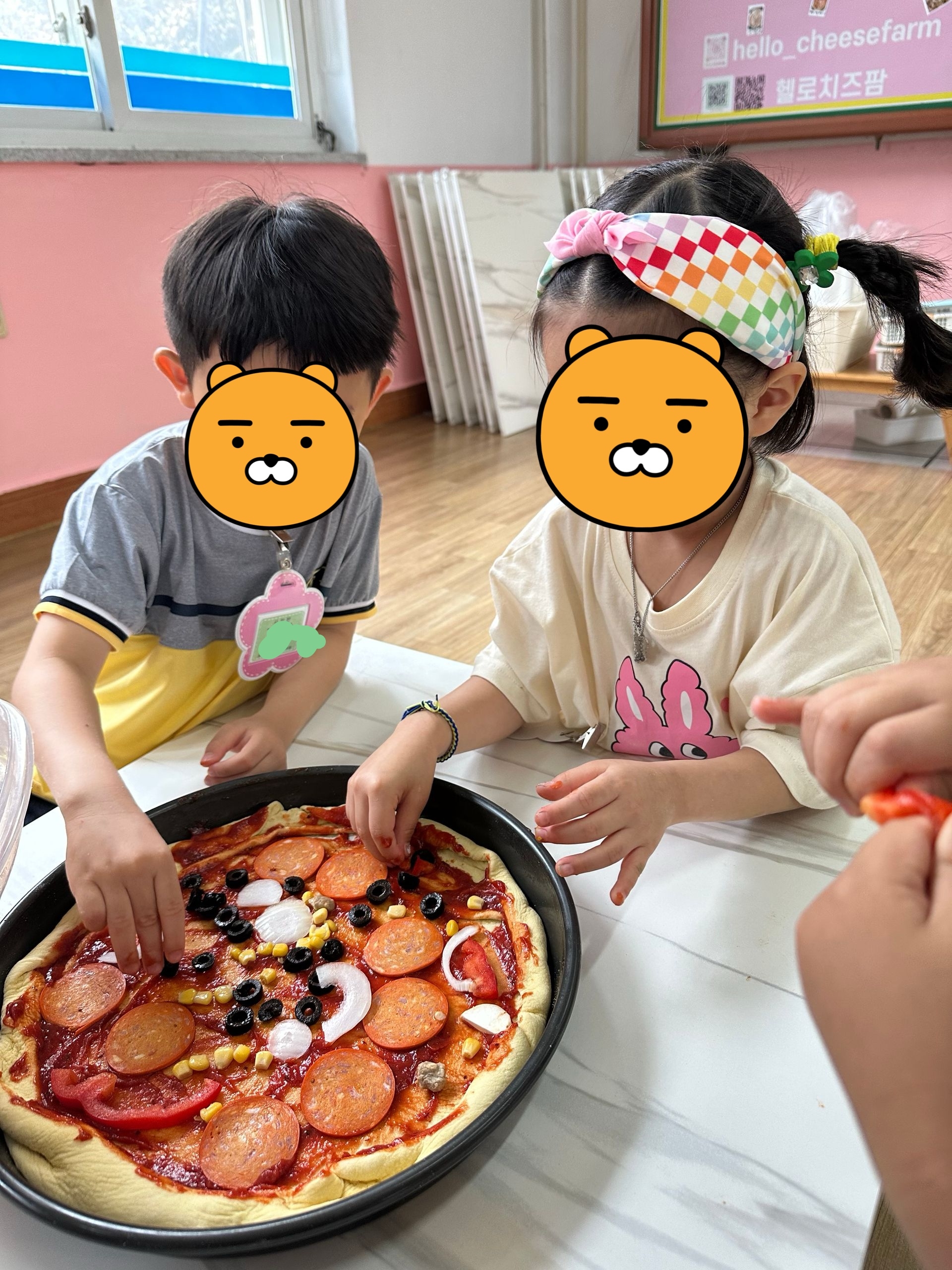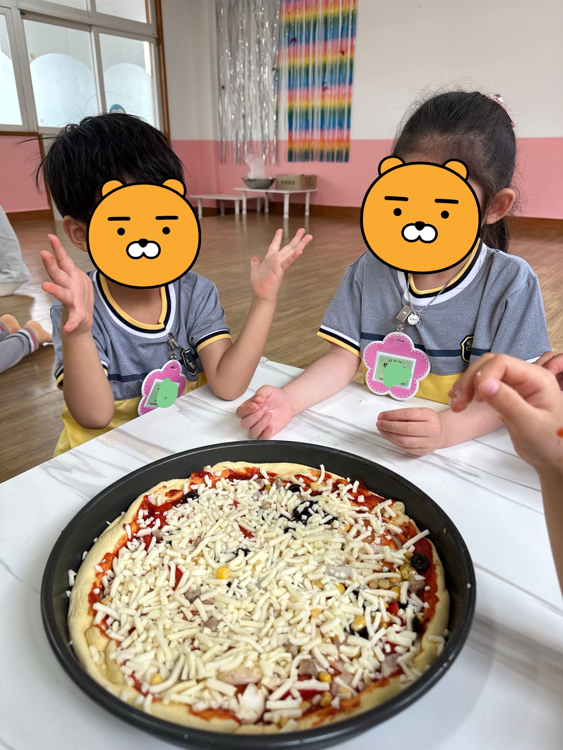 첫번째 활동은 피자만들기! 발효된 반죽에 아이들이 직접 옥수수 가루를 묻혀가며 밀대를 이용하여 점점 커지게 만들어 우리 얼굴보다 훨씬 큰 도우를 완성한 후, 다양한 식재료(양파, 파프리카, 돼지고기, 올리브, 페퍼로니, 피자치즈 등)를 올려 완성하였답니다. *두번째 활동은 치즈만들기! 치즈의 유래에 대해 재미난 이야기를 들은 후, 우리도 모짜렐라 치즈만들기에 도전해보았어요. 치즈가 이렇게나 많이 늘어난다고?!! 아이들은 치즈 아니고 슬라임 같다고...우겼습니다. 맛을 본 후에야 치즈라고 인정했답니다. ^^