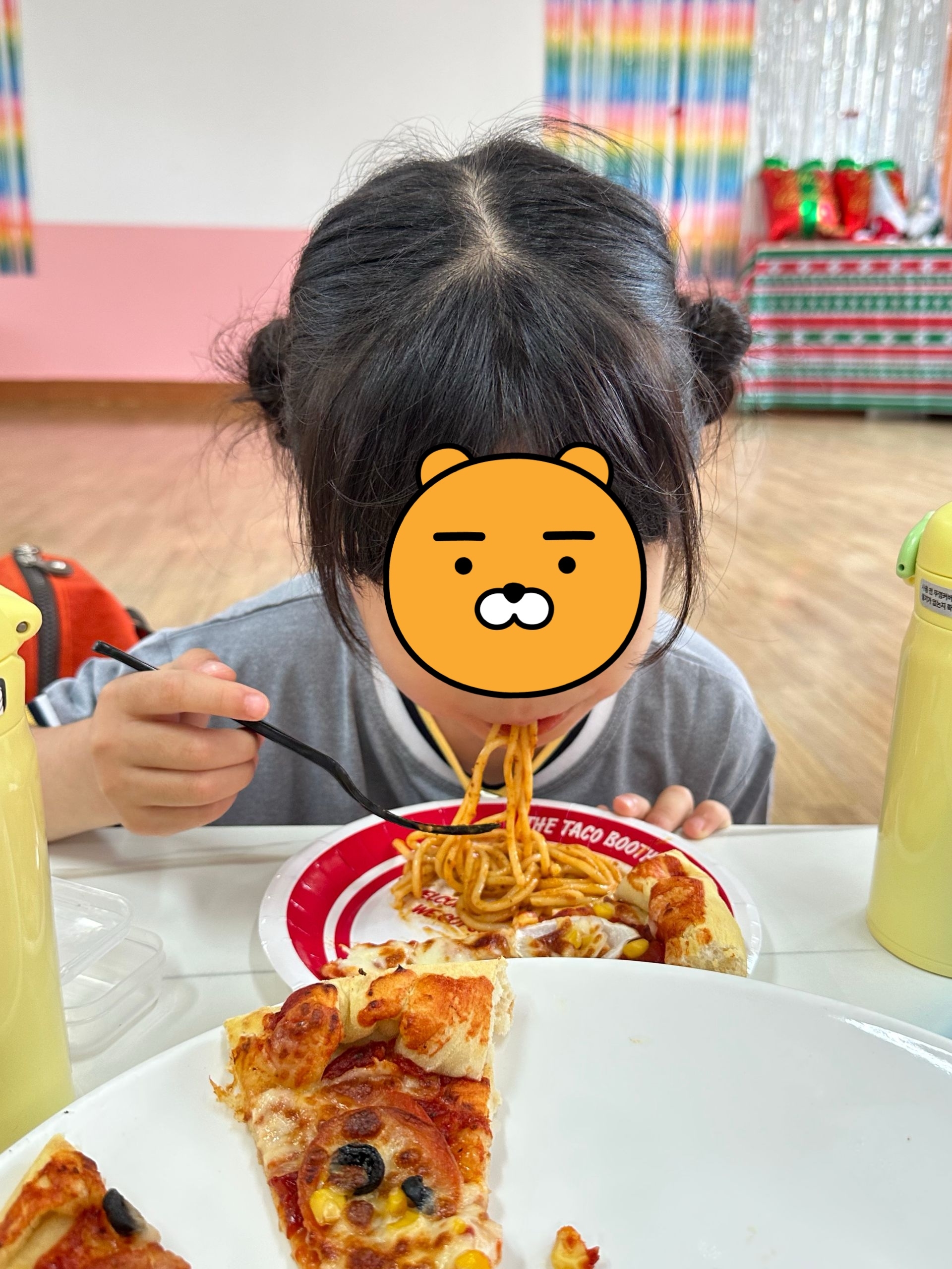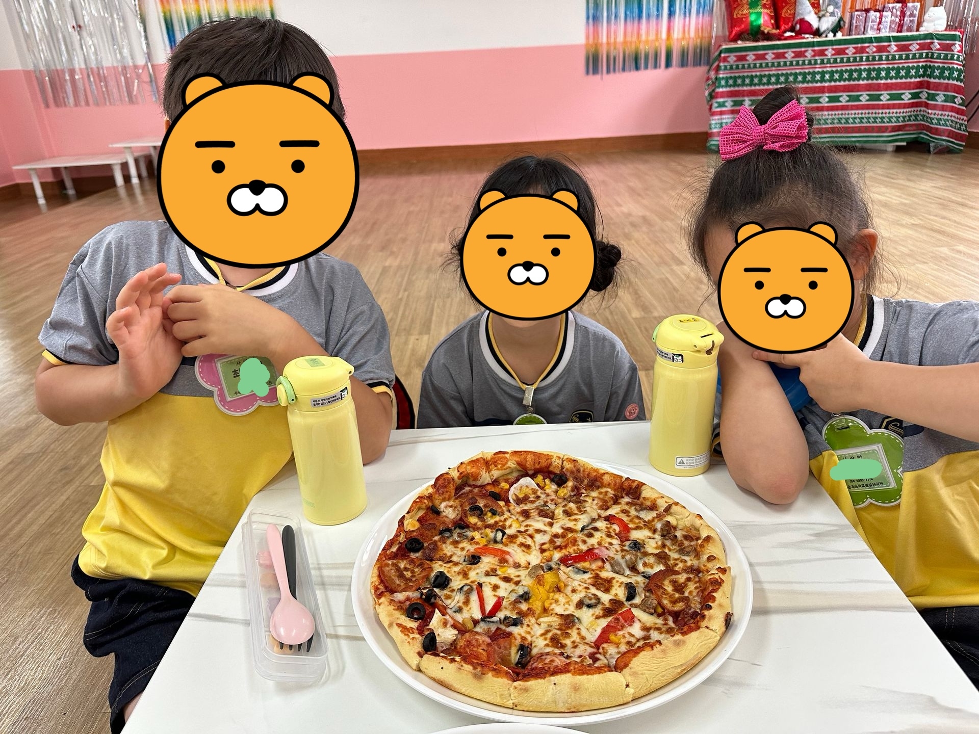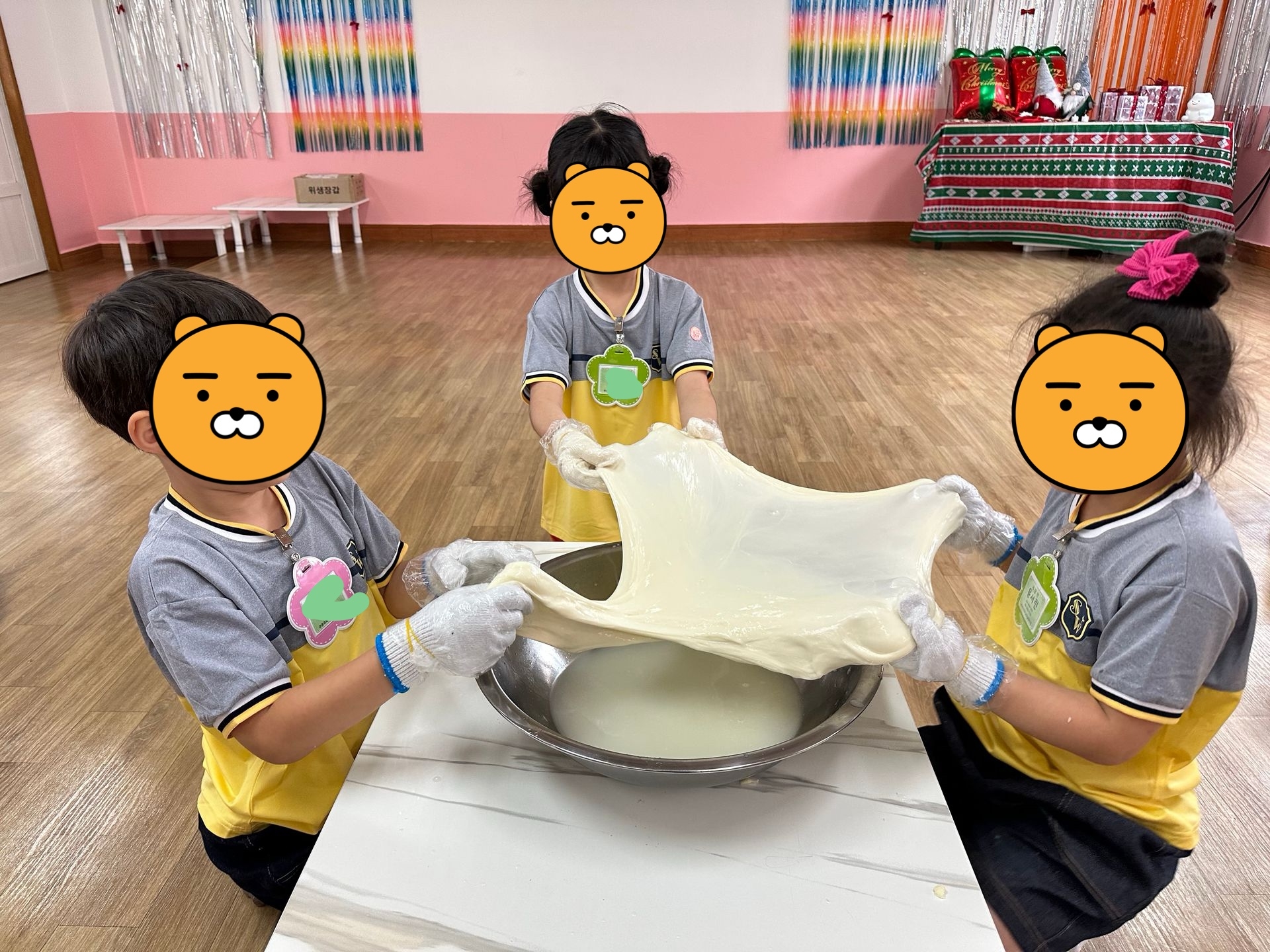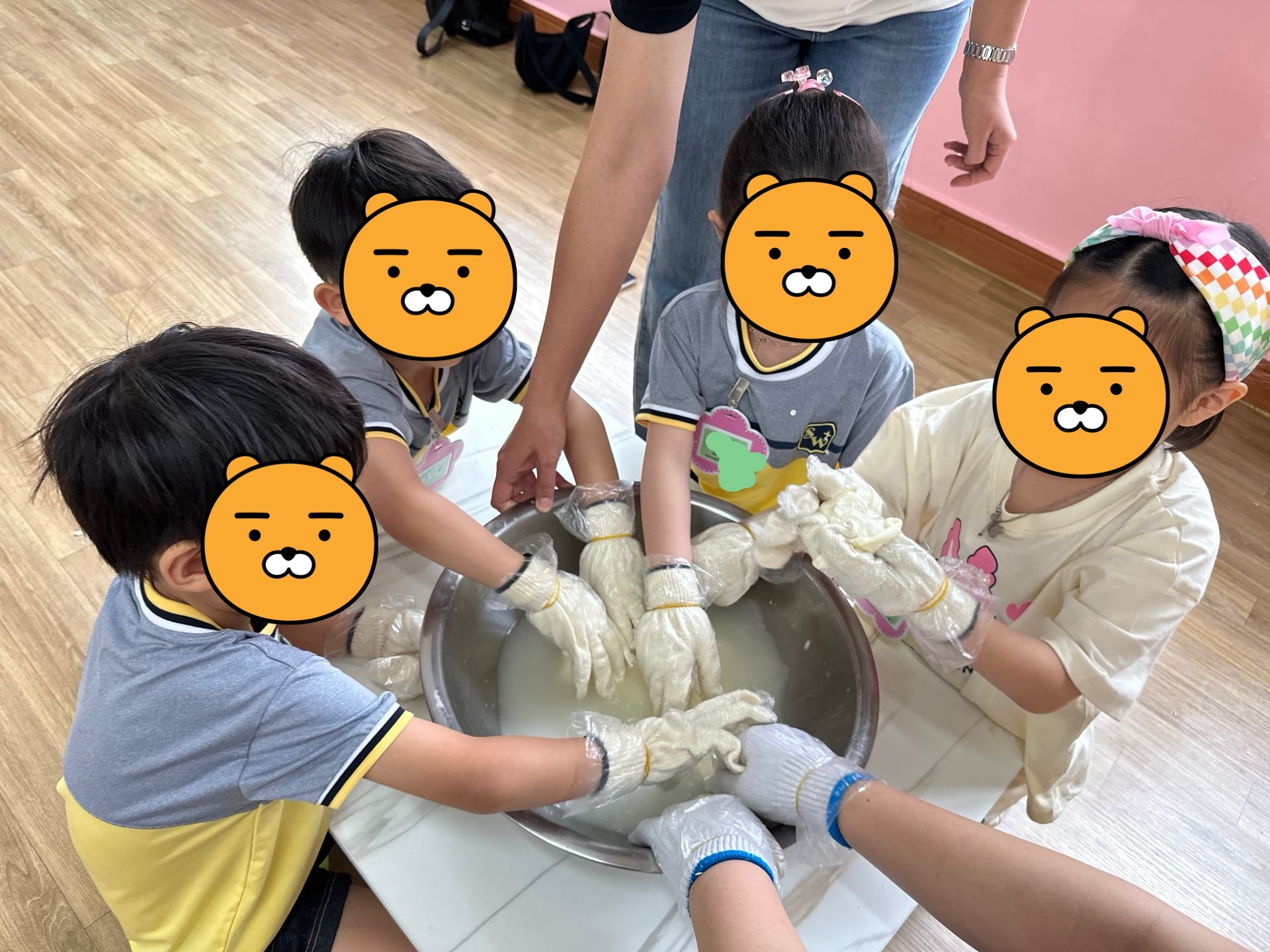 첫번째 활동은 피자만들기! 발효된 반죽에 아이들이 직접 옥수수 가루를 묻혀가며 밀대를 이용하여 점점 커지게 만들어 우리 얼굴보다 훨씬 큰 도우를 완성한 후, 다양한 식재료(양파, 파프리카, 돼지고기, 올리브, 페퍼로니, 피자치즈 등)를 올려 완성하였답니다. *두번째 활동은 치즈만들기! 치즈의 유래에 대해 재미난 이야기를 들은 후, 우리도 모짜렐라 치즈만들기에 도전해보았어요. 치즈가 이렇게나 많이 늘어난다고?!! 아이들은 치즈 아니고 슬라임 같다고...우겼습니다. 맛을 본 후에야 치즈라고 인정했답니다. ^^