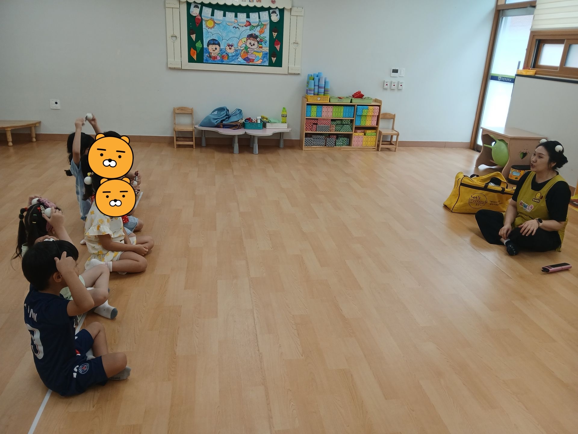 * '누가 내 머리에 똥 쌌어?'동화를 들은 후, 응가 쉐이커(아살라토) 악기를 탐색해보았어요. 연주 방법을 익혀본 후 음악에 맞추어 다양한 방법으로 연주를 했습니다.