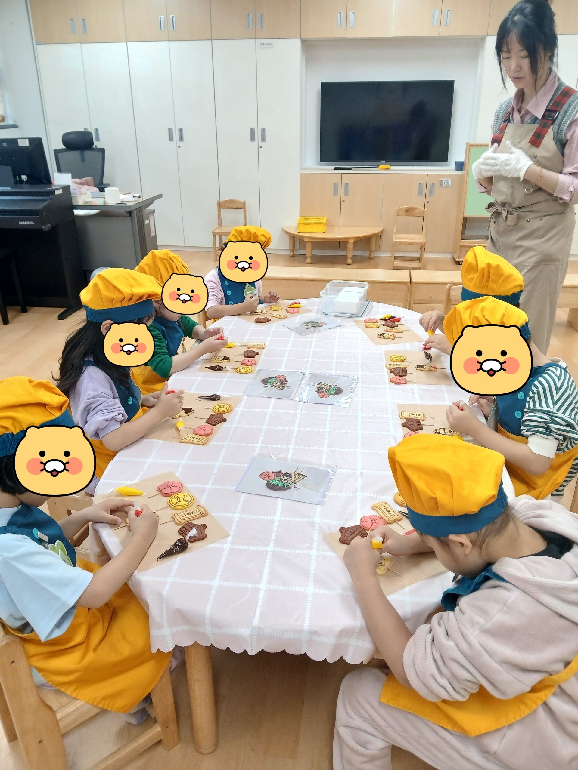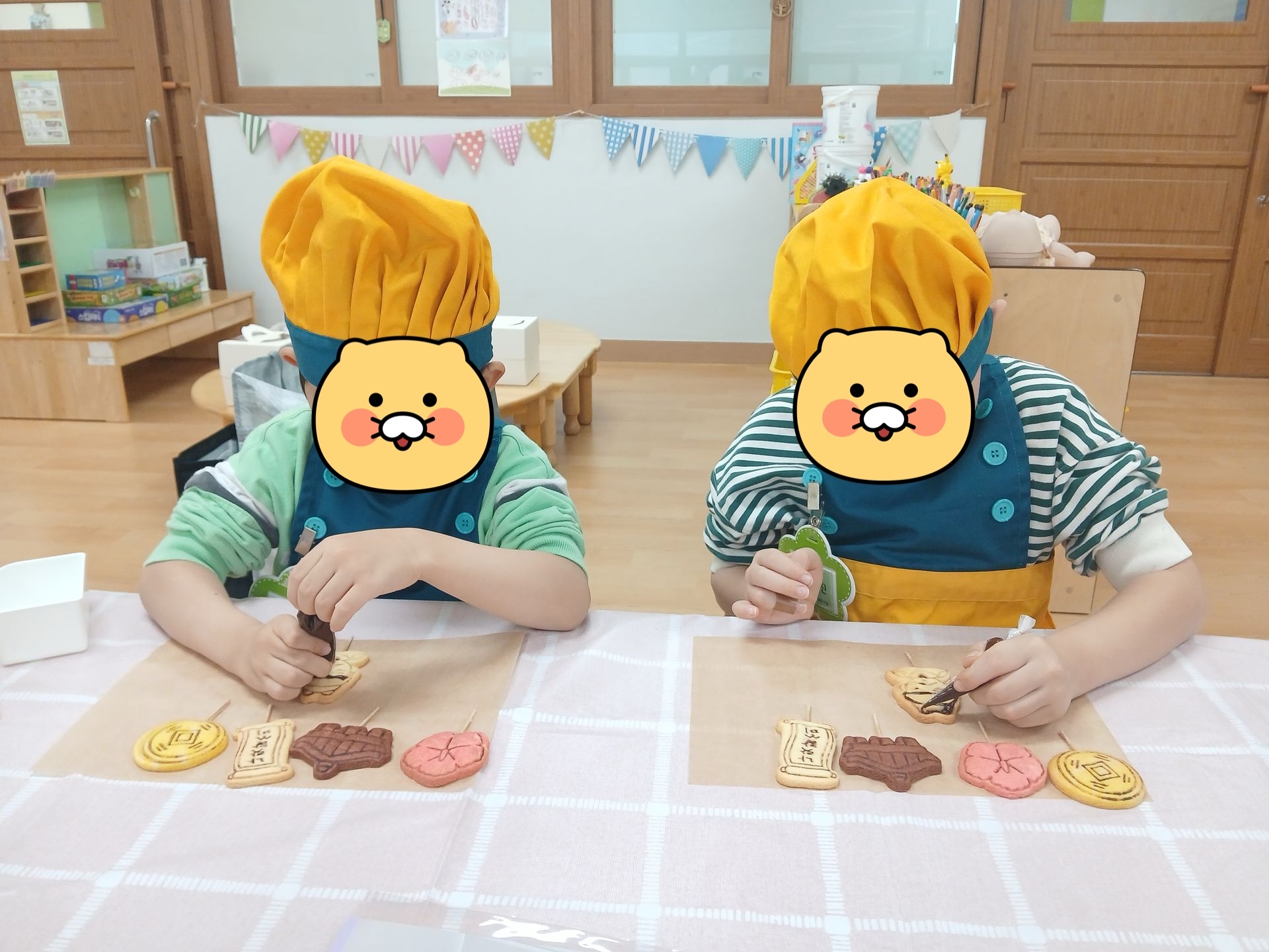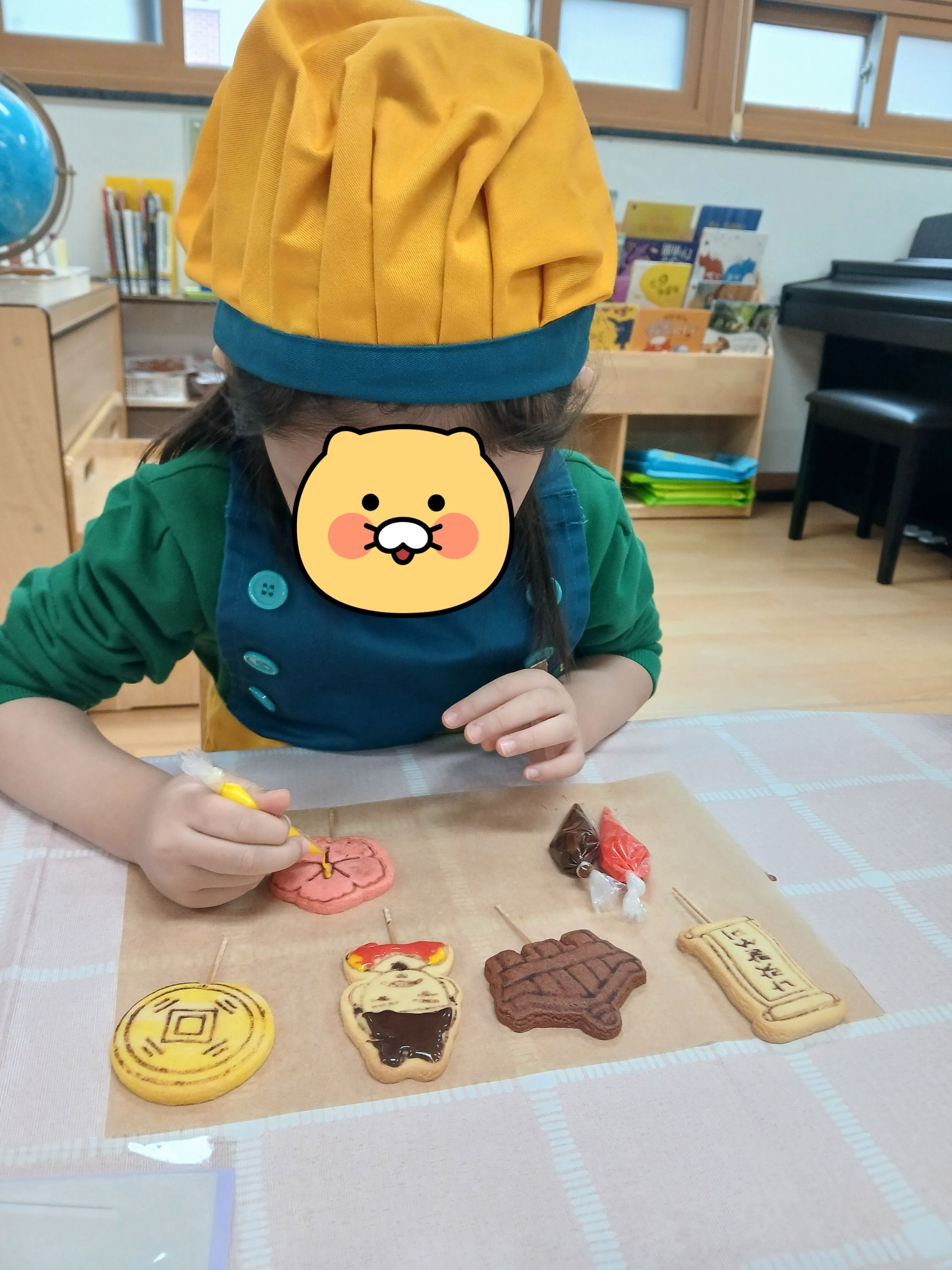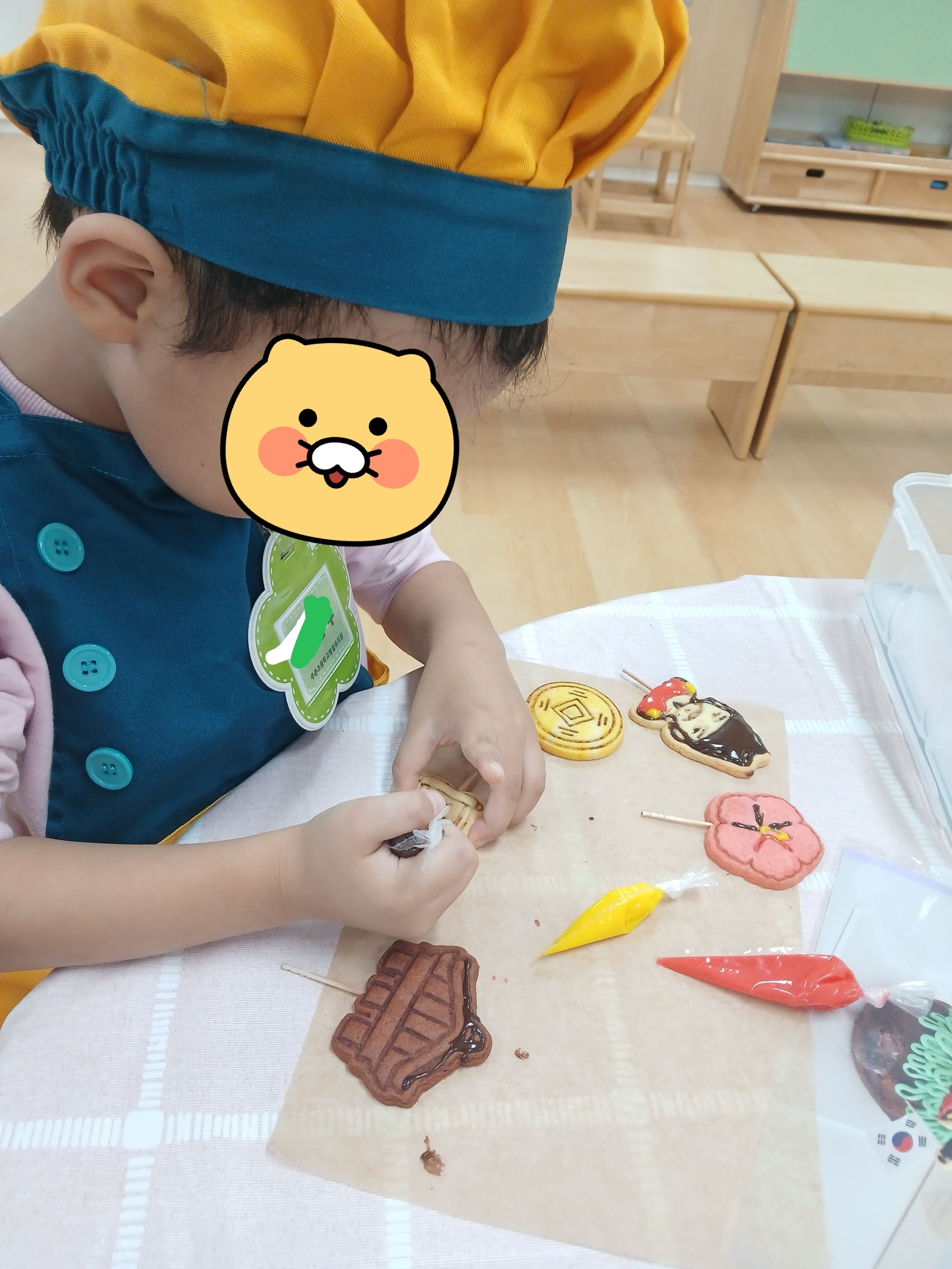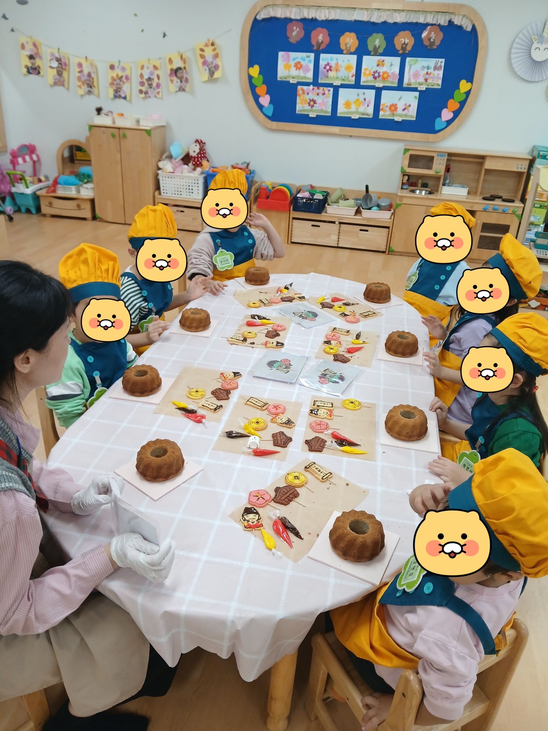 우리나라를 상징하는 쿠키를 아이싱으로 꾸민 후, 구운 구겔호프 위에 크림치즈 생크림을 짜서