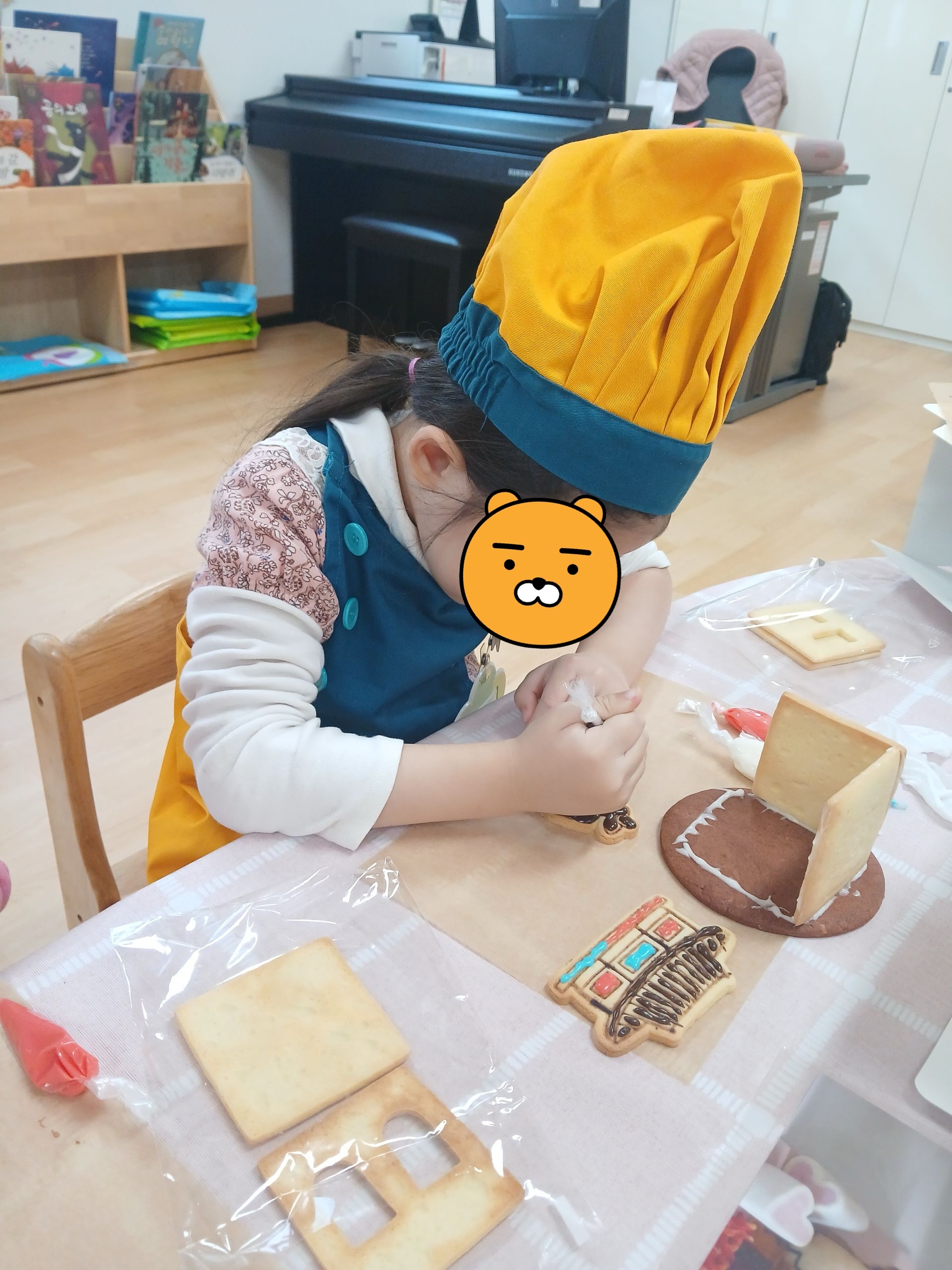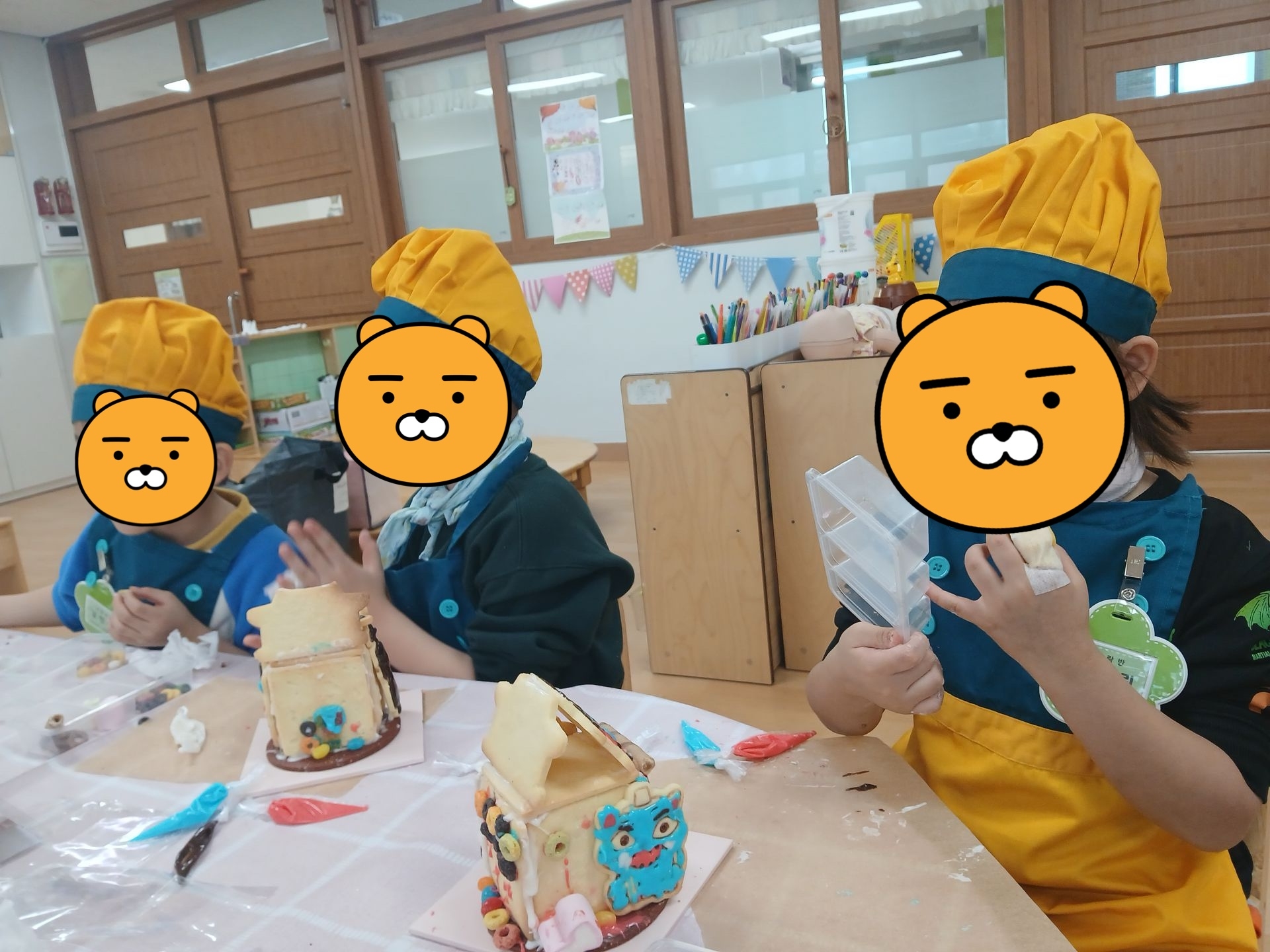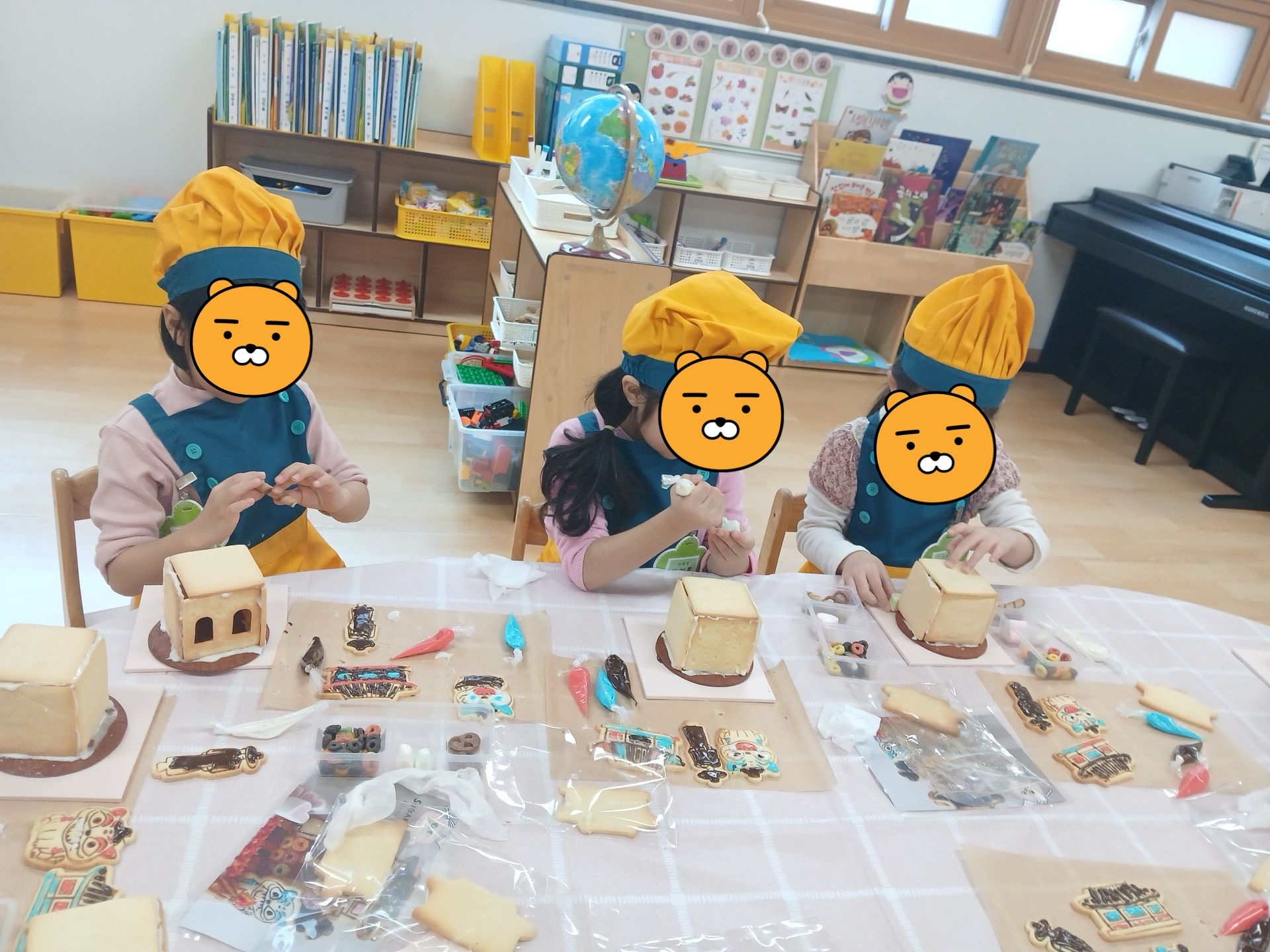 다양한 간식으로 쿠키집을 장식한 후 말리고 케이팝 데몬 헌터스 쿠키를 아이싱으로 붙여 완성하였답니다~!