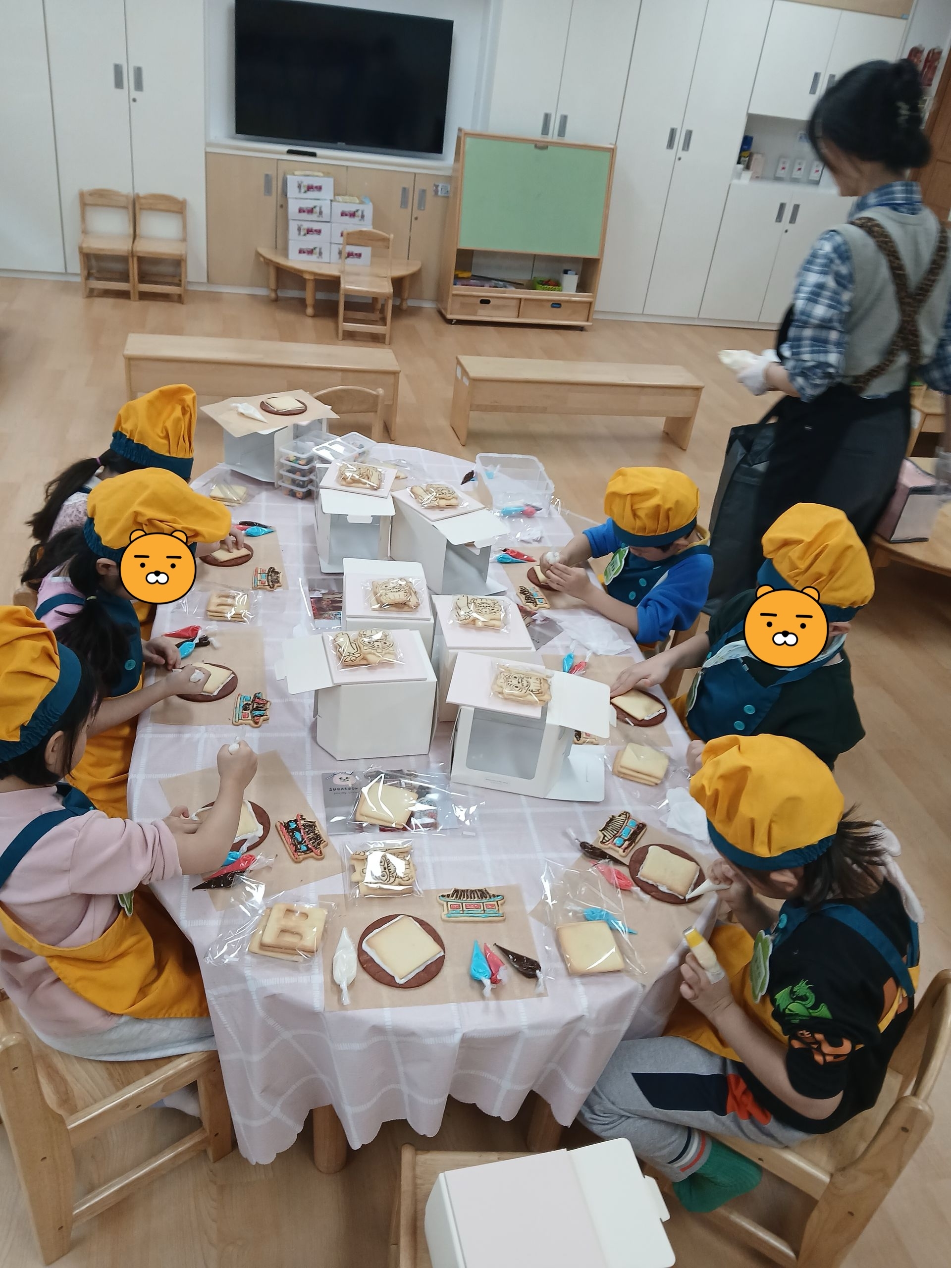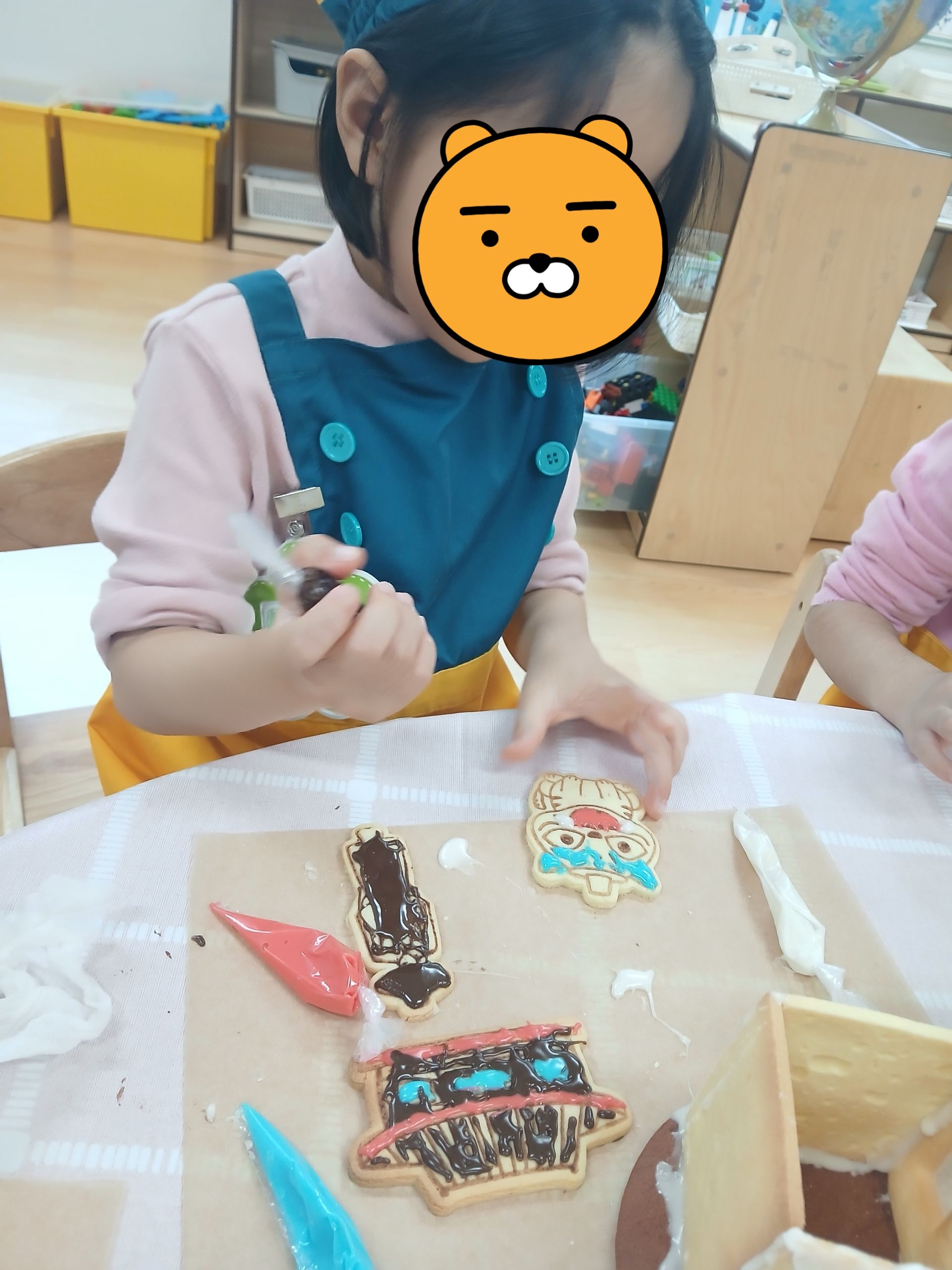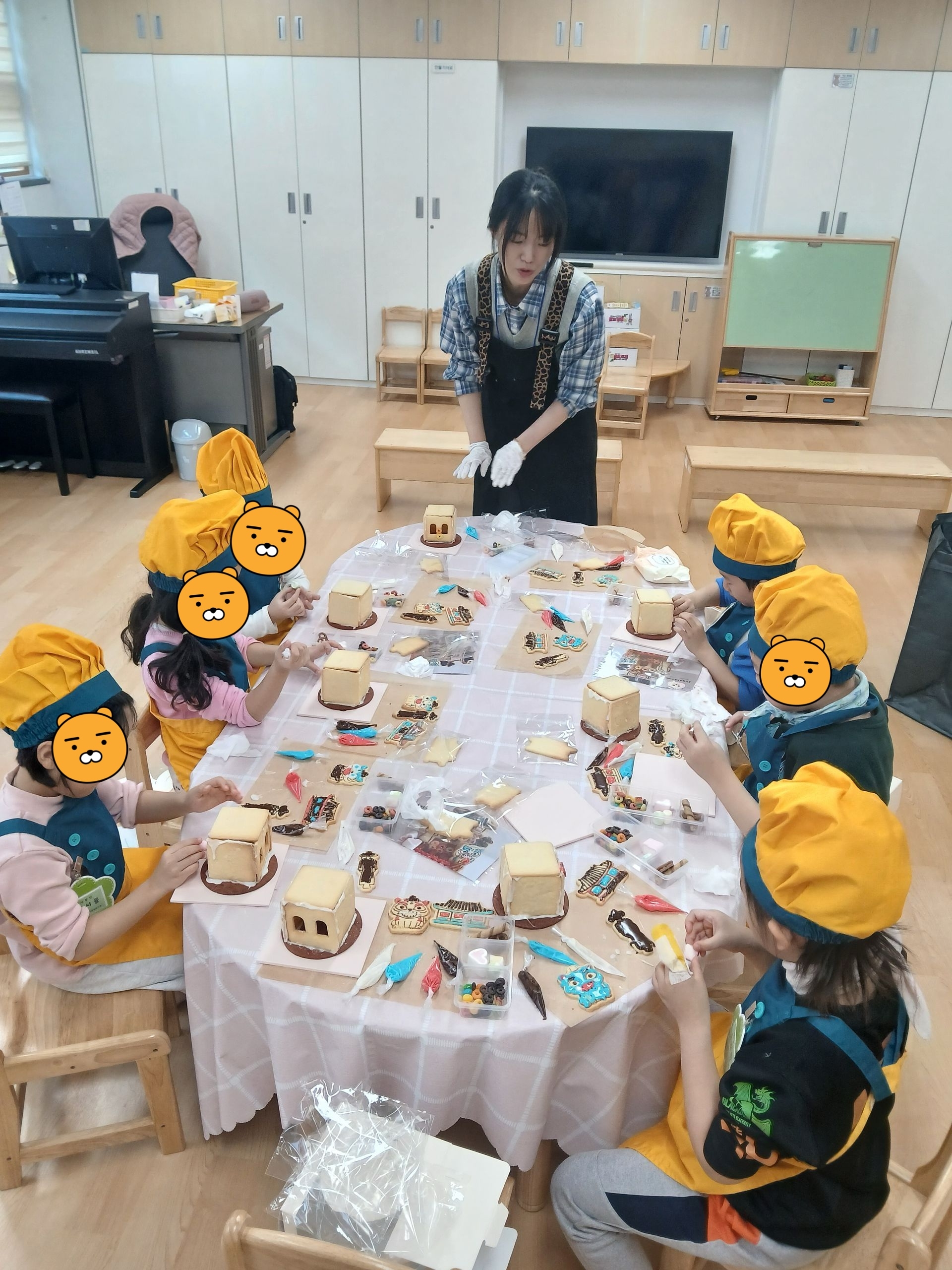 다양한 간식으로 쿠키집을 장식한 후 말리고 케이팝 데몬 헌터스 쿠키를 아이싱으로 붙여 완성하였답니다~!